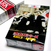 中には煙草じゃなくて駄菓子チックなチョコが 7本。それと ’80 ~ ’82年に一世を風靡したなめ猫免許証の復刻版が入っており。復刻版といっても大きさがミニサイズ化されていて、記載の内容も「猫泉純一郎」「木村猫哉」「猫崎あゆみ」等、イマ風になってたりします。