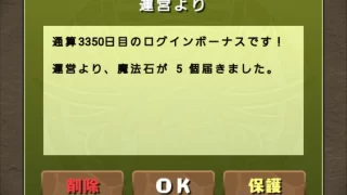 今日は通算 650日目のログインだったらしく、運営より魔法石が 5 個届いたよ。毎度ありー! 運営ちゃんアタイとの記念日憶えてくれてたのね! しかも 50日ごとに魔法石をくれるだなんて、運営ちゃんってほんと律儀。ステキ、惚れちゃう!