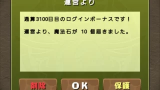 2021年もパズドラ。通算 2700日目のログインボーナスは魔法石 10個。今年もよろしく>運営ちゃん。