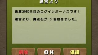 飽きずに毎日ログインしているパズドラ。ついに通算ログイン日数 4,000 を達成! そのボーナスとして、魔法石が 10個届いた。これはいつも通りのボーナス特典。