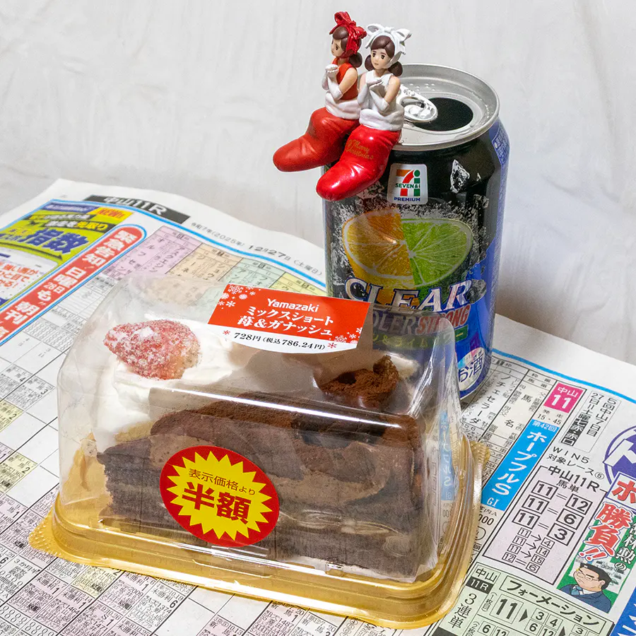 アテは半額のクリスマスケーキ。ブツはヤマザキ ミックスショート苺&ガナッシュ。今年は無事確保できた。やったぜ! 計 522円也。